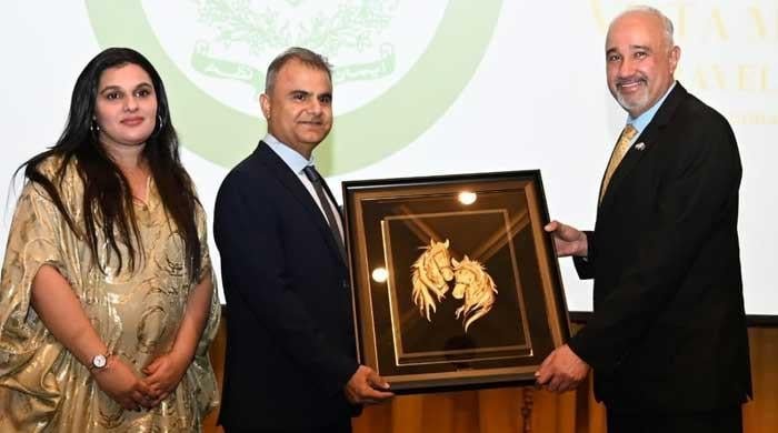 Dr Zafar Tahir presents a commemorative shield to Pakistan’s UAE Ambassador Faisal Tirmizi for his exceptional diplomatic services. — Reporter