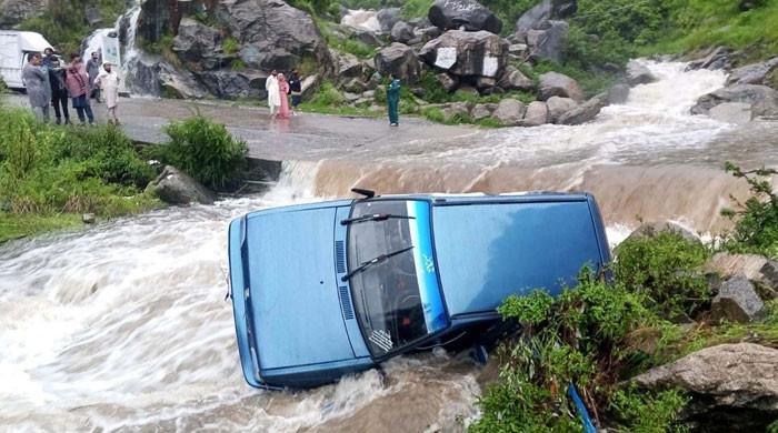 This photo shows a car being washed away by a flash flood in Mansehra, KP, on August 15, 2025. — PPI