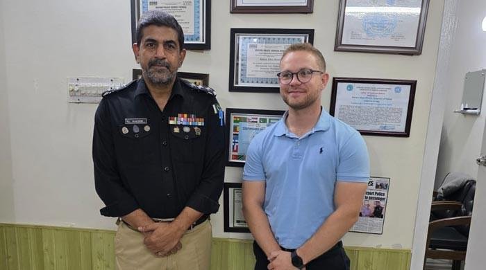 Airport SHO Kaleem Moosa poses with British police officer Duncan Woray in Karachi, in a photo released on October 7, 2025. — Karachi police