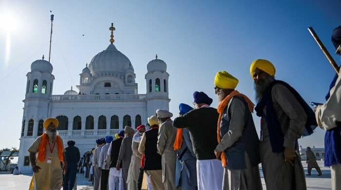 Caption: Sikh Pilgrims stand in a queue to visit the Shrine of Baba Guru Nanak Dev at Gurdwara Darbar Sahib in Kartarpur, on November 9, 2019. – AFP