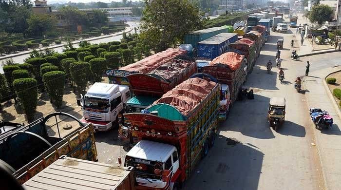 Trucks wait on a road in Karachi in this undated image. — AFP/File