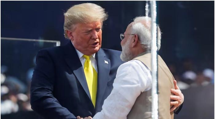 US President Donald Trump embraces with Indian Prime Minister Narendra Modi during the “Namaste Trump” event at Sardar Patel Gujarat Stadium, in Ahmedabad, India, February 24, 2020.US last month doubled tariffs on imports from India to 50%.Indian FM says country will continue to buy Russian…