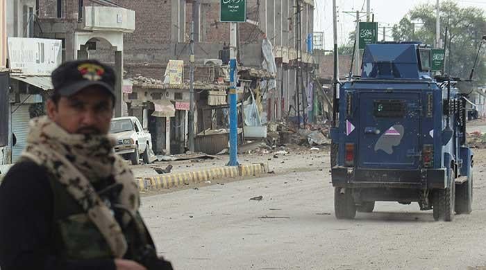 A police officer stands guard on a street with damaged shops in the background, following a militant attack on the FC headquarters in Bannu, Khyber Pakhtunkhwa on September 2, 2025. 138 civilians, 79 police personnel martyred in KP: police report.51 suspects named in terror incidents,…