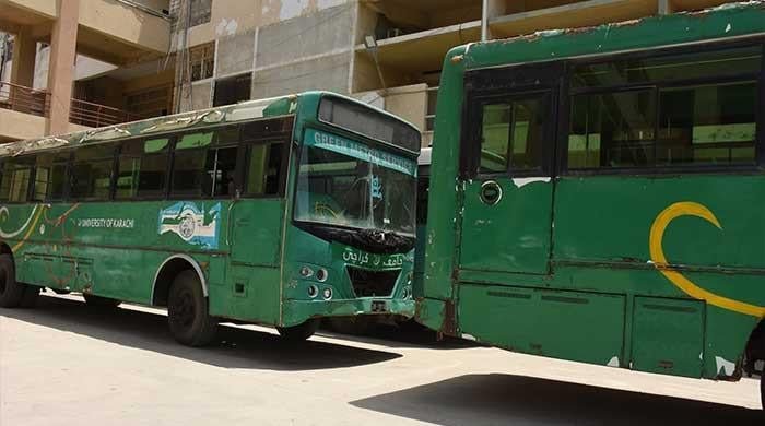 This file photo shows University of Karachi campus buses parked in the varsity premises. — Facebook/@kutimesPolice detain driver; victim’s family declines legal action.Students stage protest, demand transport safety.Governor, minister seek detailed investigation reports.