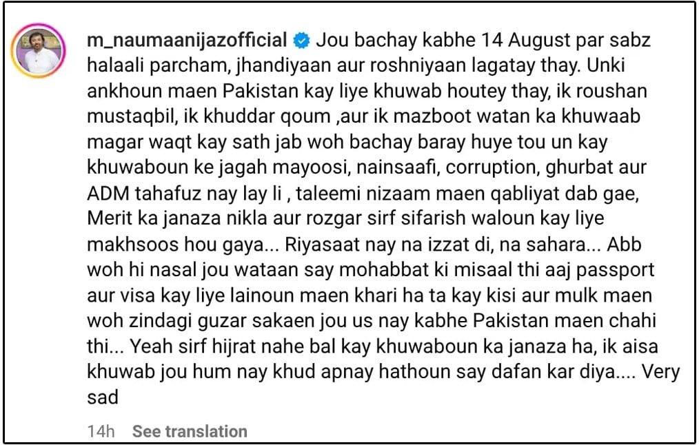 The embattled actor Noman Ijaz opened up in a post on the occasion of Independence Day and raised questions about the future of the youth.
