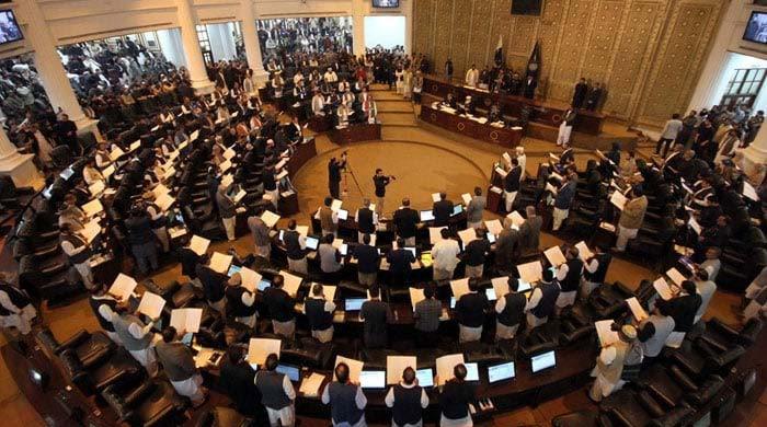 An inside view of a Khyber Pakhtunkhwa Assembly session in Peshawar on February 28, 2024. — PPIVoting for KP chief minister scheduled for tomorrow.PML-N, JUI-F yet to agree on consensus nominee.JUI-F mulls Durrani, Lutfur Rehman; PML-N backs Ibadullah.