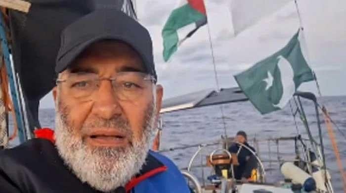 Screengrab shows former senator Mushtaq Ahmed Khan aboard the Gaza-bound vessel, part of the Global Sumud Flotilla. — X@SenatorMushtaq