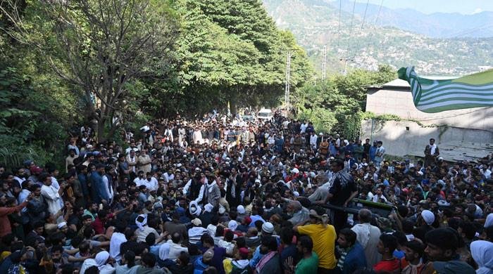 Awami Action Committee activists gather during a demonstration in Muzaffarabad on October 1. — AFPPM expresses concern over unfortunate incidents in AJK.Premier includes more ministers in negotiation committee. Shehbaz appeals AJK protesters to remain peaceful.