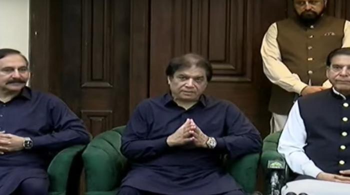 Hanif Abbasi addresses a press conference flanked by Tariq Fazal Chaudhry and Raja Pervaiz Ashraf in Islamabad on August 23. — Geo News