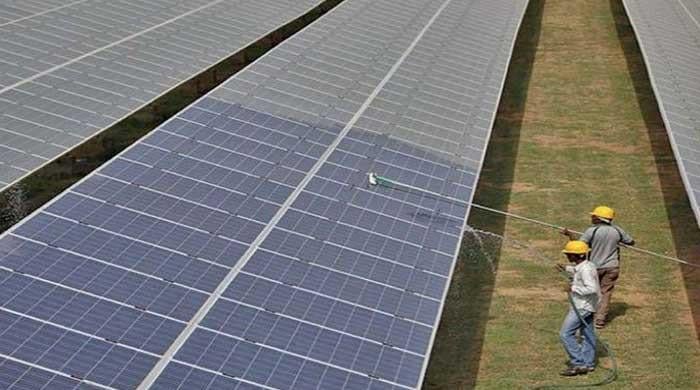 Two workers clean off dust accumulated on solar panels. — SSEP website/FileAmount borrowed from WB exceeds actual cost of solar kits.Solar DC fans distributed by altering import documents.Sindh minister says relevant documents will be provided.