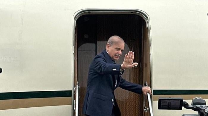 Prime Minister Shehbaz Sharif waves back at cameras while getting on his plane before his flight to China on August 30, 2025. — X@CMShehbazPM to also meet Premier Li Qiang and other world leaders. Visit aimed at deepening strategic cooperative partnership. DPM…