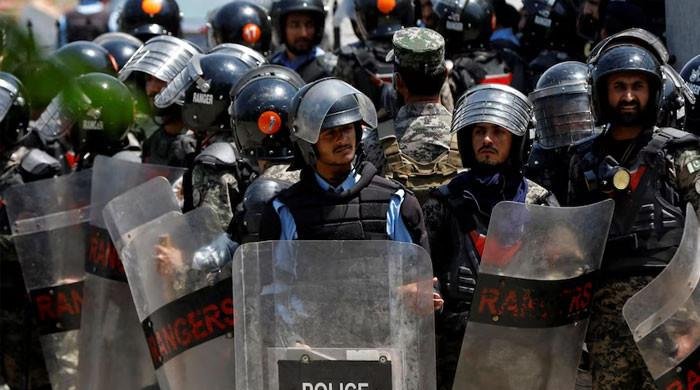 Polieceman are seen in position to tackle prtotestors in Karachi in this undated image. — ReutersTLP announces march towards Islamabad on October 10.No road blockades, disruptions to traffic are allowed: police.Administration places containers at Faizabad Interchange.