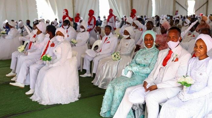 Priest Vusi Ndala wait during the Easter Sunday mass wedding ceremony, organised by the International Pentecostal Holiness Church Jerusalem City , with Philisiwe Ndala and Noko Ndala, his first wife and new bride, to form a polygamous union, in Kgabalatsane, in the North-West province,…
