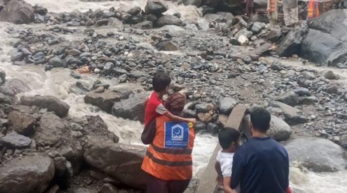 Rescuers carry children away from their flood-devastated village in the Buner region in Khyber Pakhtunkhwa. — Al Khidmat Foundation