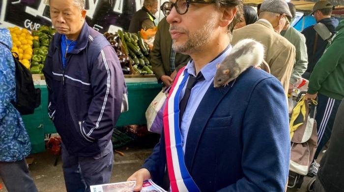 Unlike most rats, this one has a name, Plume, and gets to enjoy the rare privilege of wandering around Paris on the shoulder of its owner, a local politician.