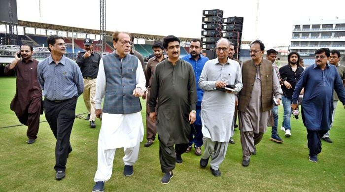 Provincial Ministers Saeed Ghani and Syed Zulfiqar Ali Shah, along with Arts Council Karachi President Ahmed Shah, are reviewing preparations for a mega musical concert at National Bank Stadium Karachi. — APP