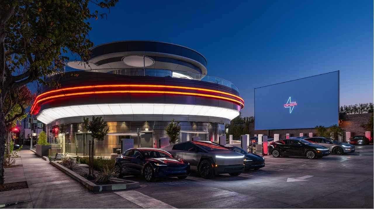 Tesla’s new West Hollywood diner combines EV charging with entertainment, offering drive-in movies on LED screens, car-side service and all-day dining experience.